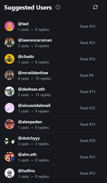 I’ve replaced the onchain music player in the right sidebar with a new suggested users table that shows random active /music members from this month’s leaderboard.
