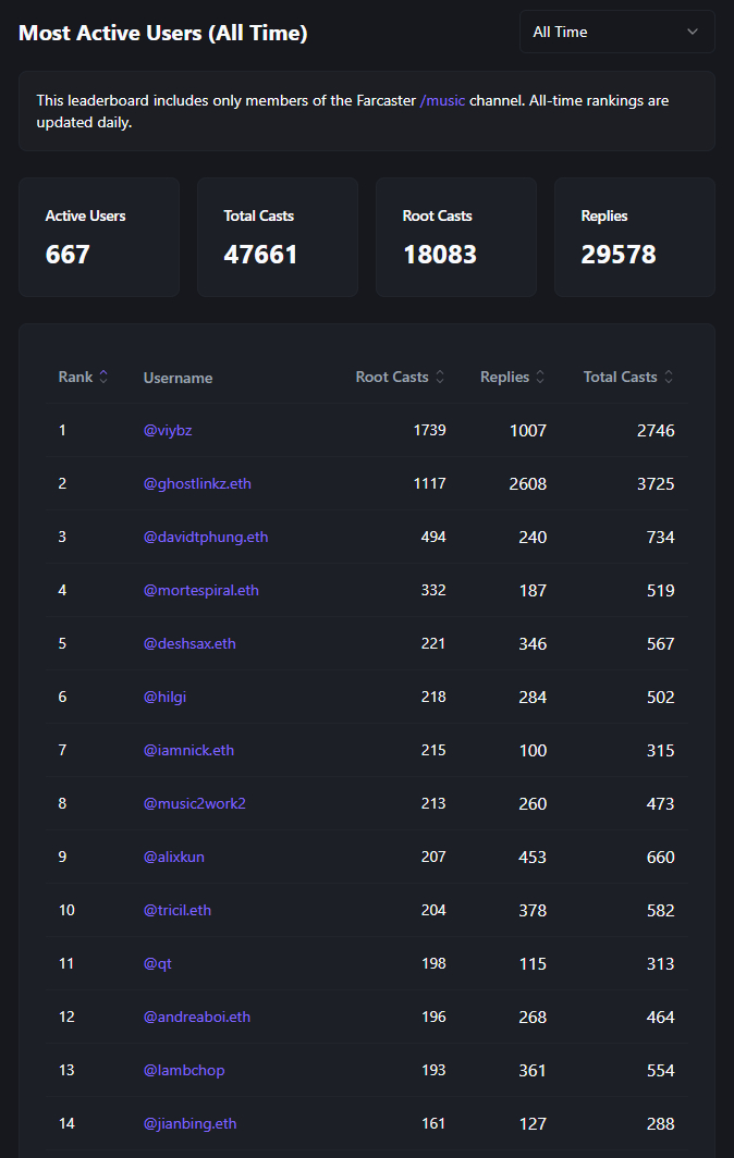 Track the most active members in the /music channel on Farcaster. Two leaderboards: